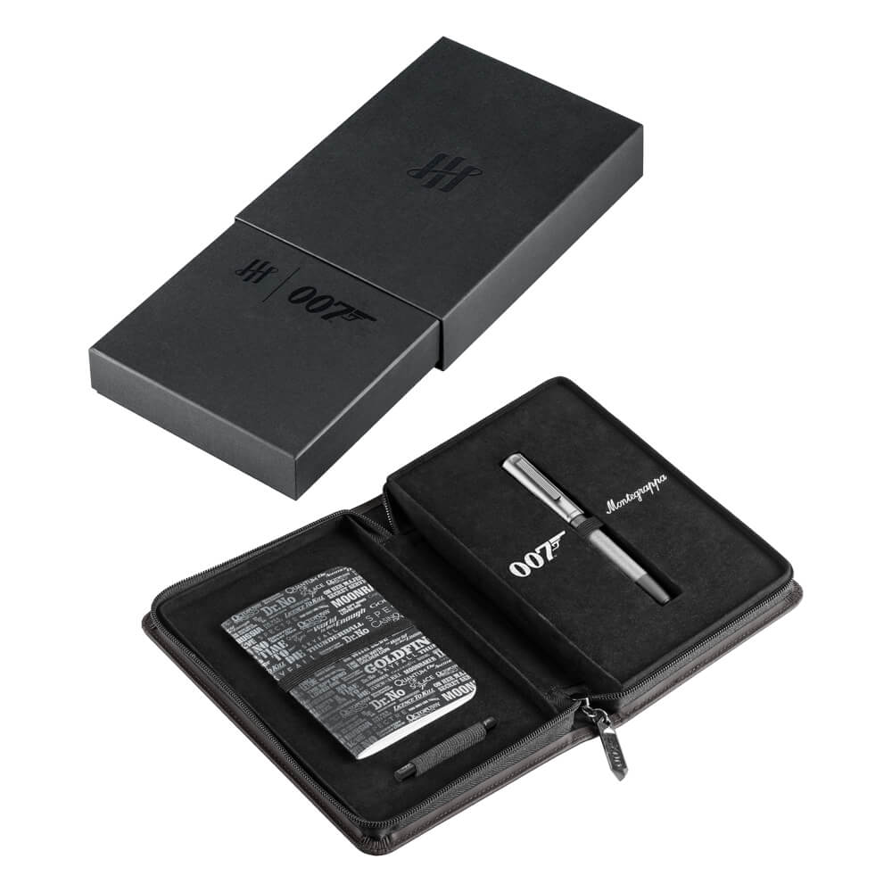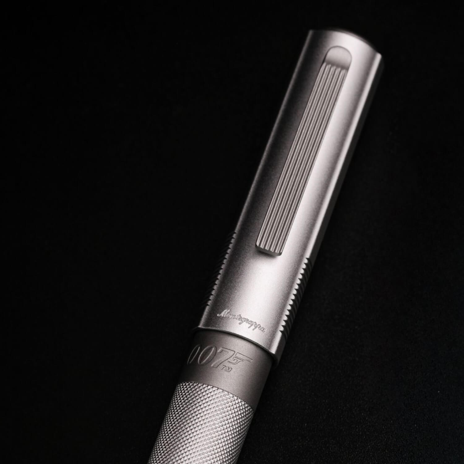 シリーズの劇中で最も有名な決め台詞の一つ「Bond、James Bond」の名乗りの様に、シンプルでいて力強さを持つイメージで製作された本製品。アルミニウムと真鍮、ステンレススチールを組み合わせた存在感のあるボディに施された、拳銃のグリップを思わせるローレット加工や、天冠のホローポイントキャップトップなどシリーズを通して共通の仕様はそのままに、マットなシルバーを基調としたモノトーンでまとめた外装は、魅惑的かつ落ち着いた印象を与えます。