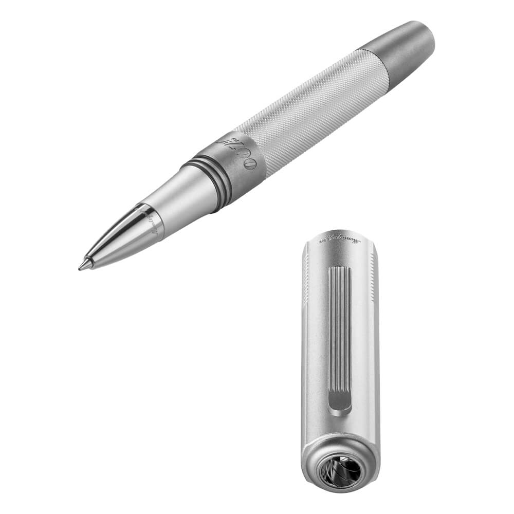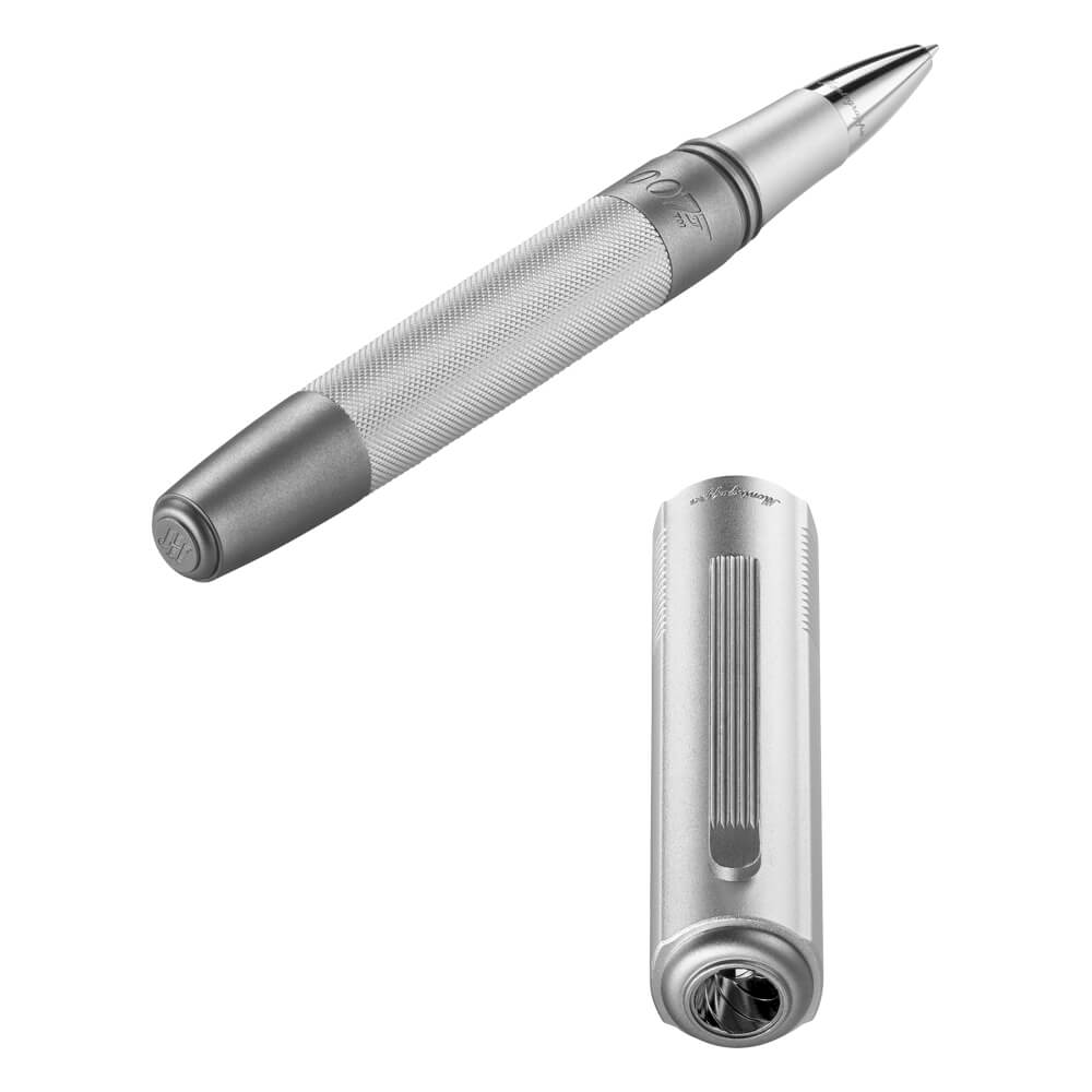 シリーズの劇中で最も有名な決め台詞の一つ「Bond、James Bond」の名乗りの様に、シンプルでいて力強さを持つイメージで製作された本製品。アルミニウムと真鍮、ステンレススチールを組み合わせた存在感のあるボディに施された、拳銃のグリップを思わせるローレット加工や、天冠のホローポイントキャップトップなどシリーズを通して共通の仕様はそのままに、マットなシルバーを基調としたモノトーンでまとめた外装は、魅惑的かつ落ち着いた印象を与えます。