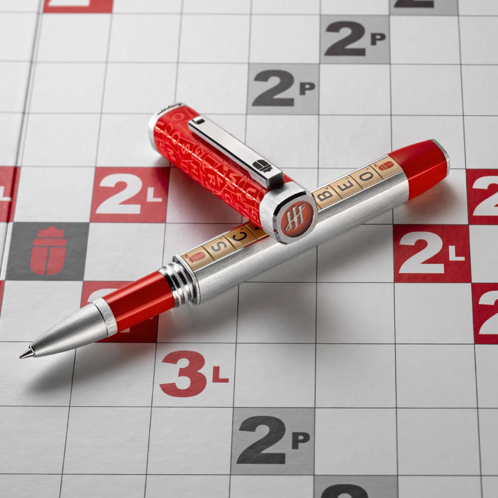 化粧箱はオリジナルのボードゲームのボックスを模倣したカスタムパッケージ仕様で、アルファベット26文字の文字タイルが納められたベルベット製の文字タイルポーチと、万年筆にはキャップにロゴが彫刻されたボトルインクが付属します。