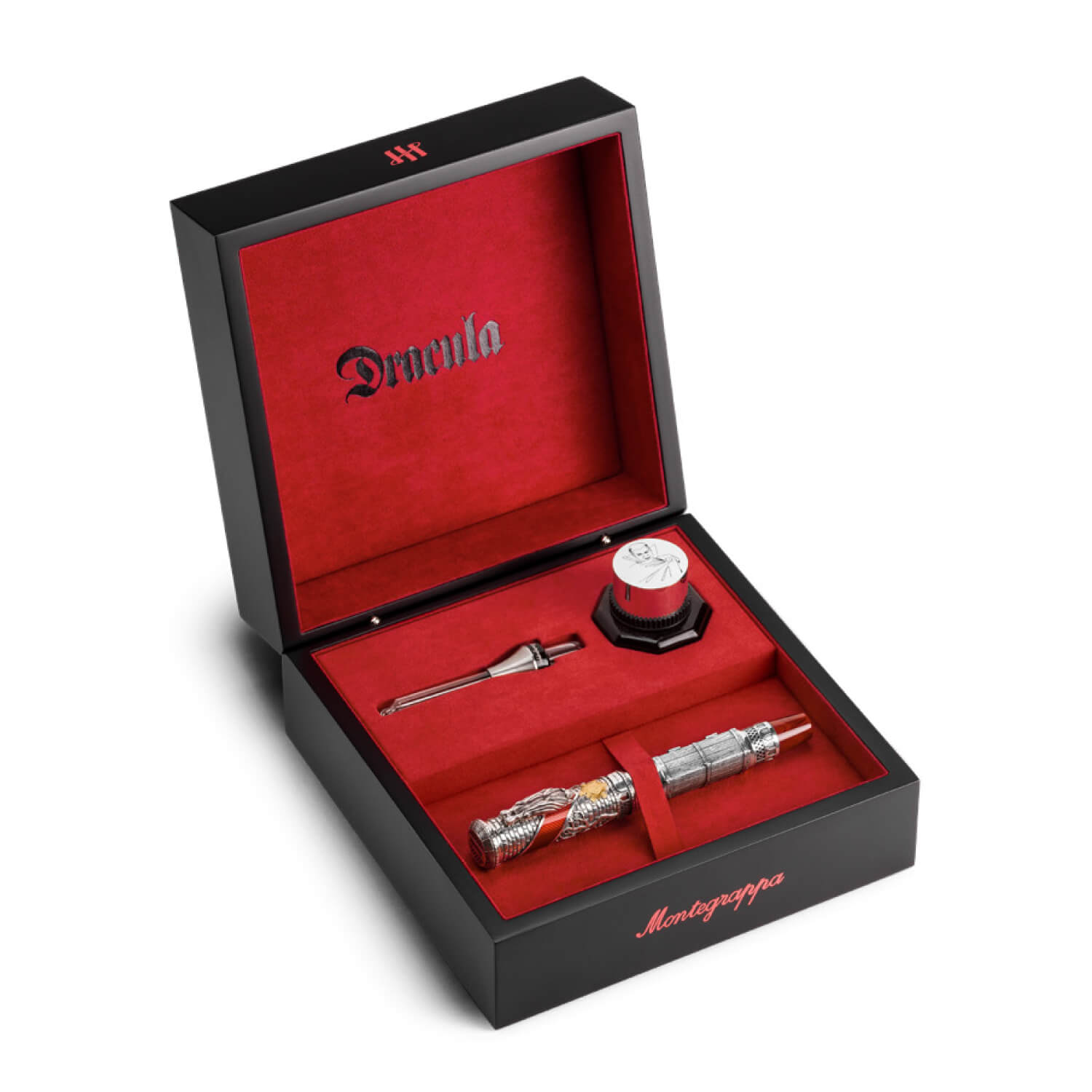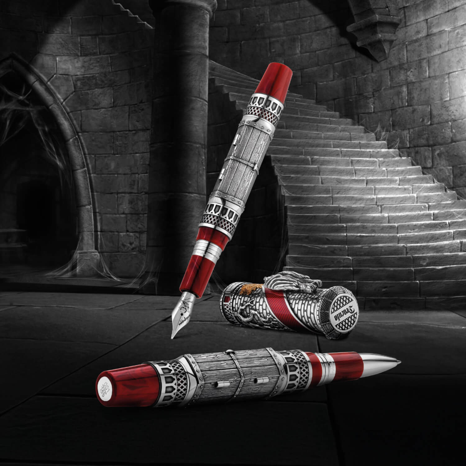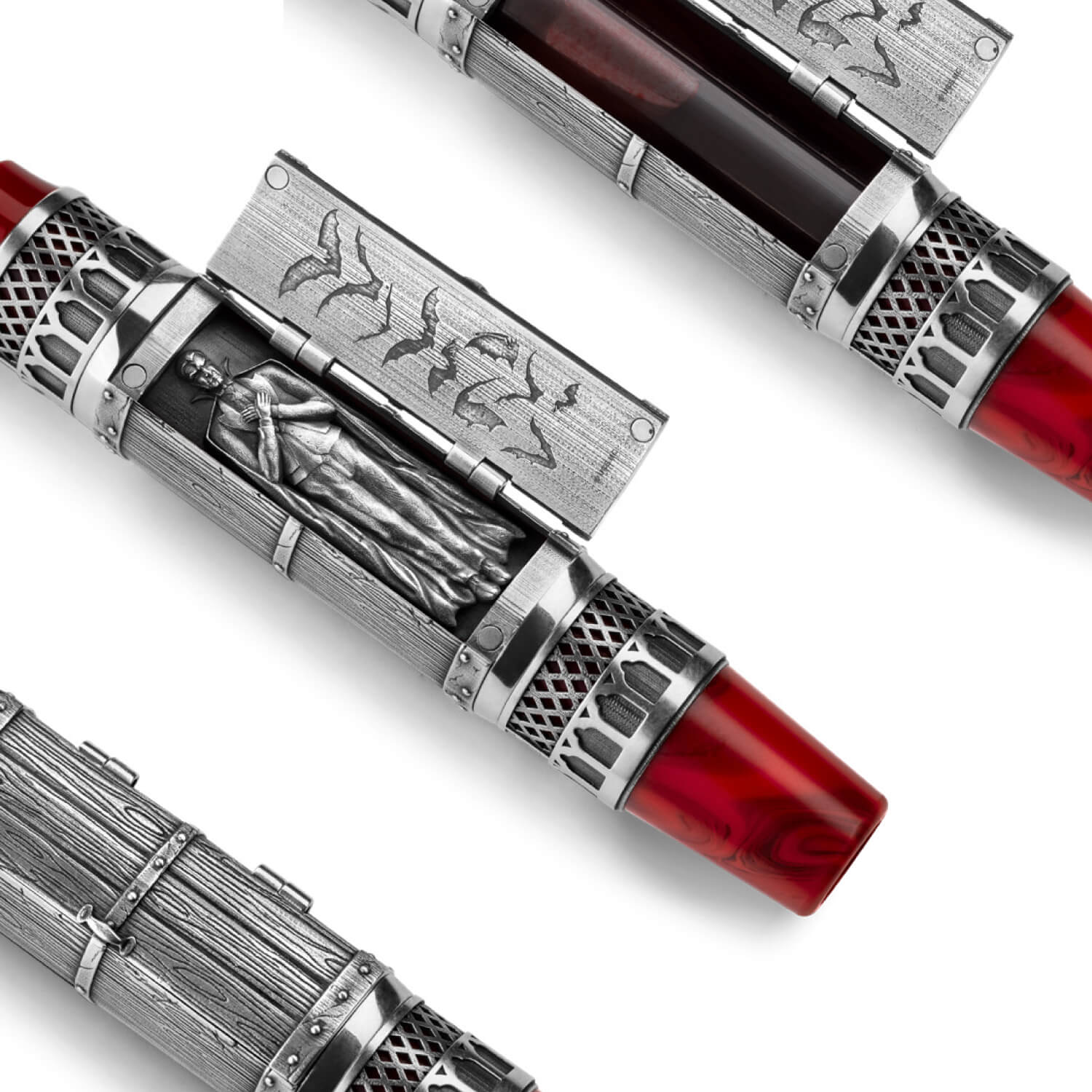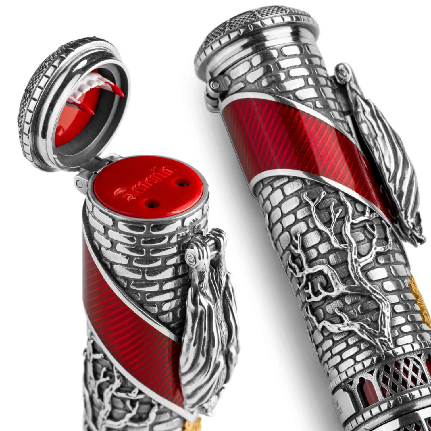 スターリングシルバーのキャップはドラキュラの居城の外壁をイメージしたテクスチャーになっており、コウモリを象ったクリップが、侵入者を見張る様に目を光らせます。また、キャップを横切るように配置された、深紅の階段を思わせるクリムゾンカラーのエナメルと、クリップ下部のヴェルメイユ素材のメダリオンが華やかさを添えます。開閉できる天冠部分には牙が仕込まれており、ドラキュラの恐怖を表現しています。 ボディにも開閉できるギミックが盛り込まれており、秘密のドアを開けると、ローラーボール仕様には横たわるドラキュラ伯爵の彫刻が、万年筆仕様には同モデルで初採用となる「フリードロップリザーバー」のインクタンクが現われます。筆記スタイルは万年筆(EF、F、M、B、Stub1.1)とローラーボールから選択可能、万年筆にはインク充填用のアイドロッパーと、特別仕様のレッドのボトルインクが付属します。